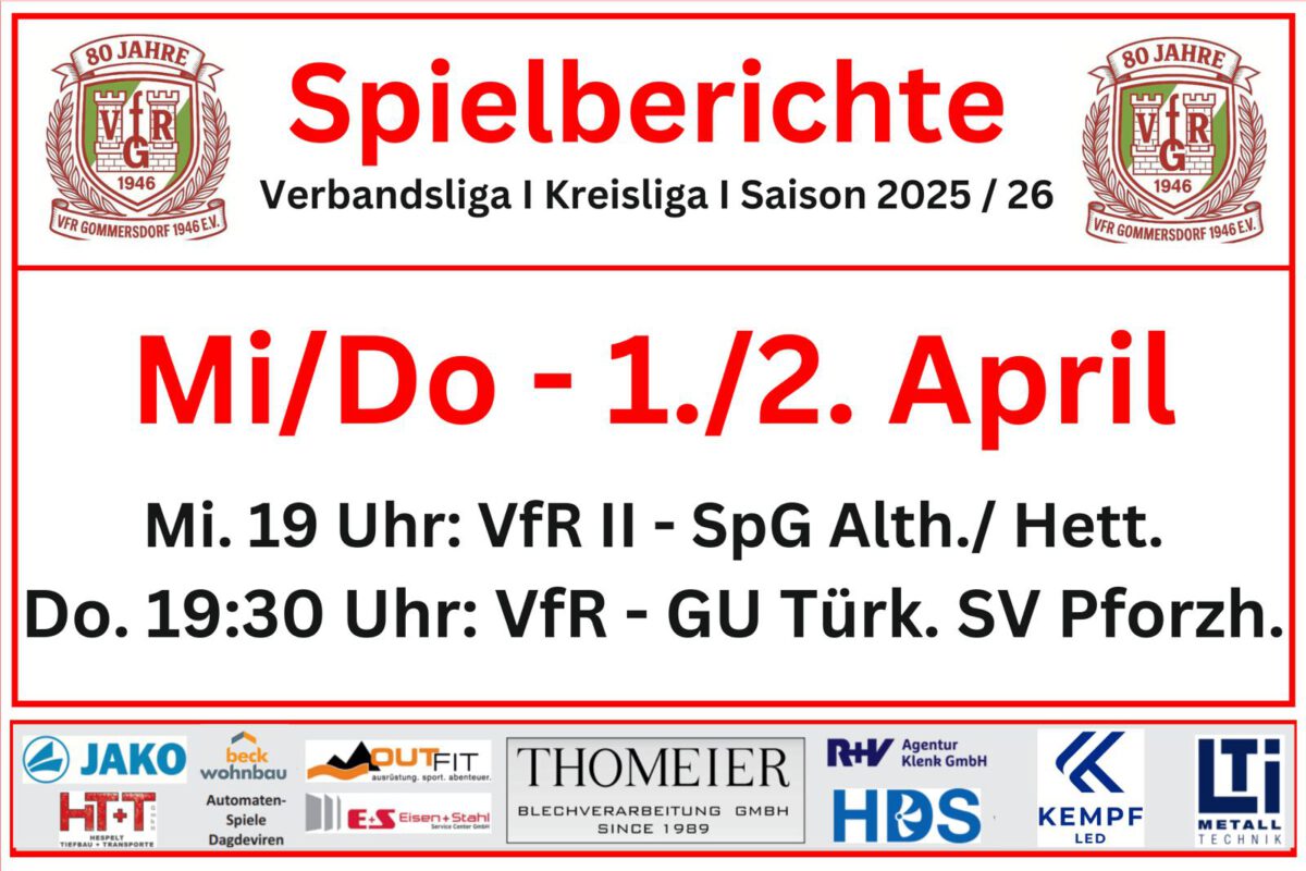 Mittwoch 01.04.2026, 19:00 Uhr: VfR Gommersdorf II – SpG Altheim/ Hettingen